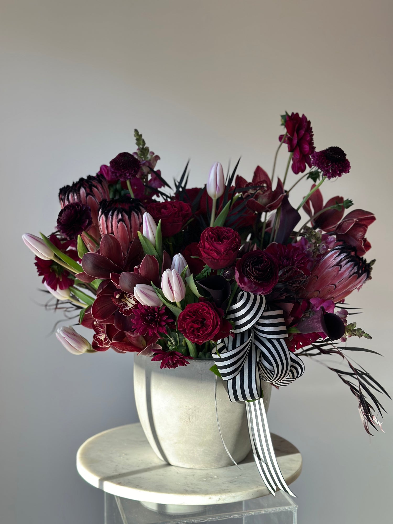 An elegant composition of rich burgundy florals accented with soft white blooms, featuring tulips, roses, and more. Finished with a chic black and white bow, Endless Love is a timeless statement of romance with a modern, couture touch.