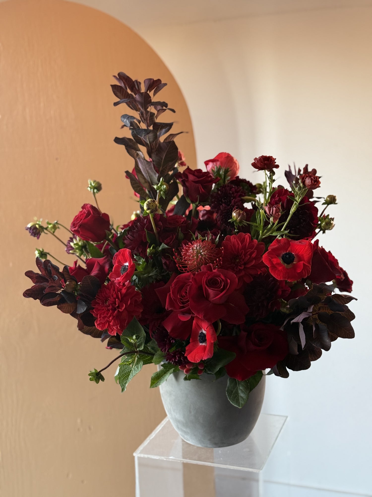 A romantic arrangement showcasing shades of seasonal red florals, thoughtfully designed in an elegant gray pot. Timeless and refined, My Valentine is a modern expression of classic Valentine’s Day romance.