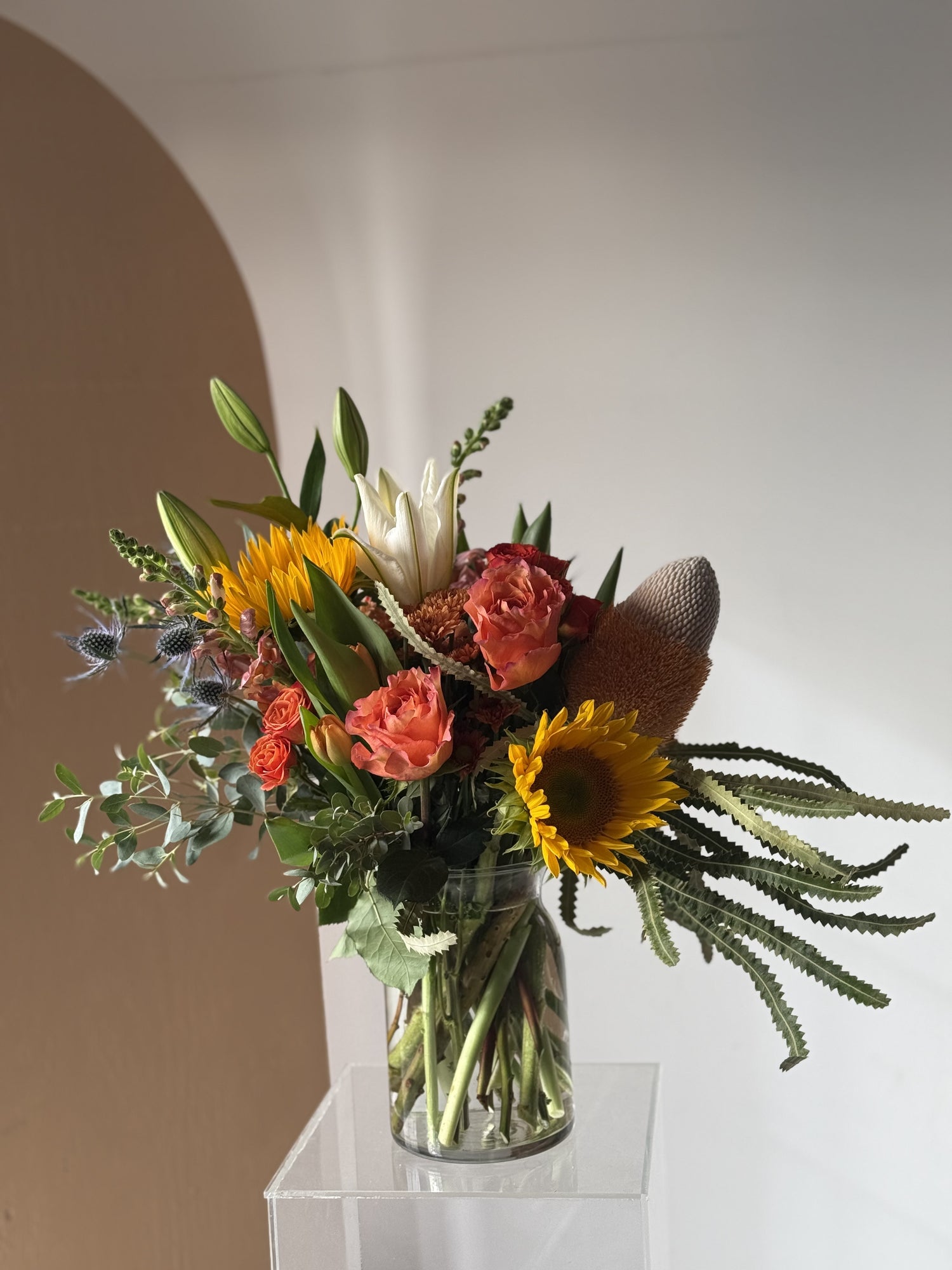 A vibrant arrangement featuring sunny yellow sunflowers, unique banksia, striking blue thistle, and seasonal accents. Designed to capture the warmth and energy of a desert sunrise, this centerpiece brings a bold, modern, and colorful touch to any space.