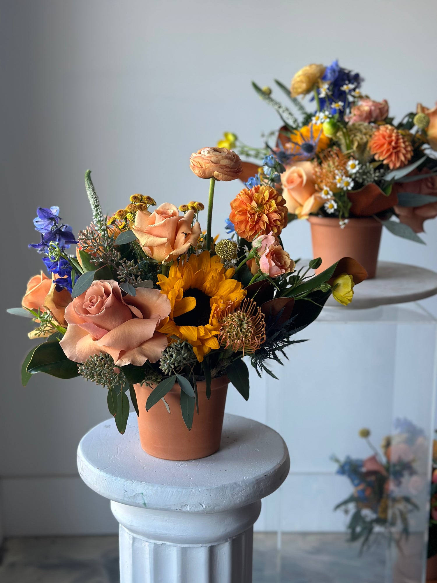 Warm and inviting fall arrangement in a terracotta base, featuring seasonal blooms including rich Moab roses and a delicate touch of blue delphinium. Perfectly balanced for a modern autumn look, this arrangement brings seasonal charm and a pop of color to your soul.