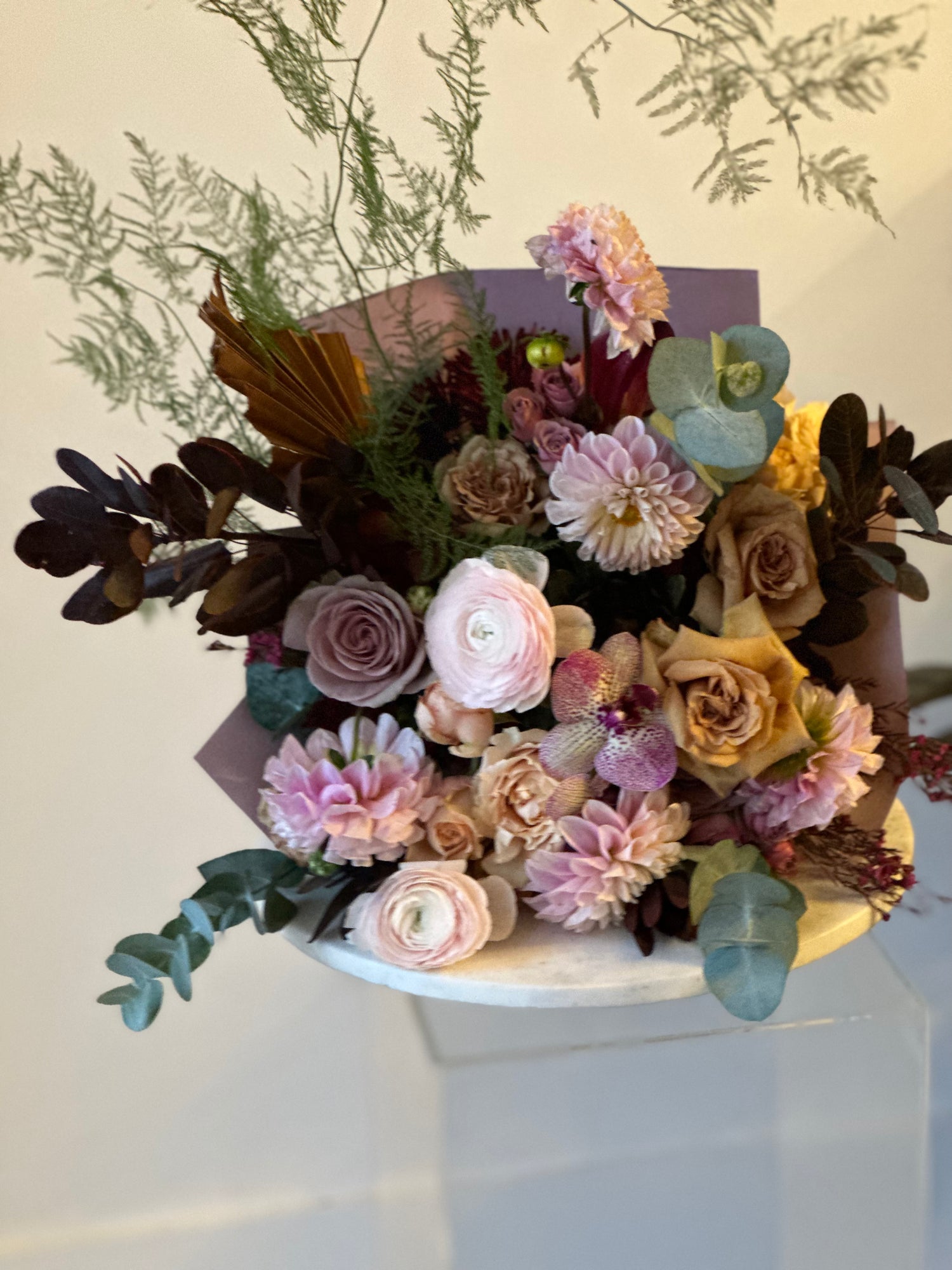Exact florals change based upon seasonal availability. I always pick the freshest, highest-quality blooms to ensure your arrangement lasts. If you have a specific flower request, please email or call me and I will do my best to accommodate.