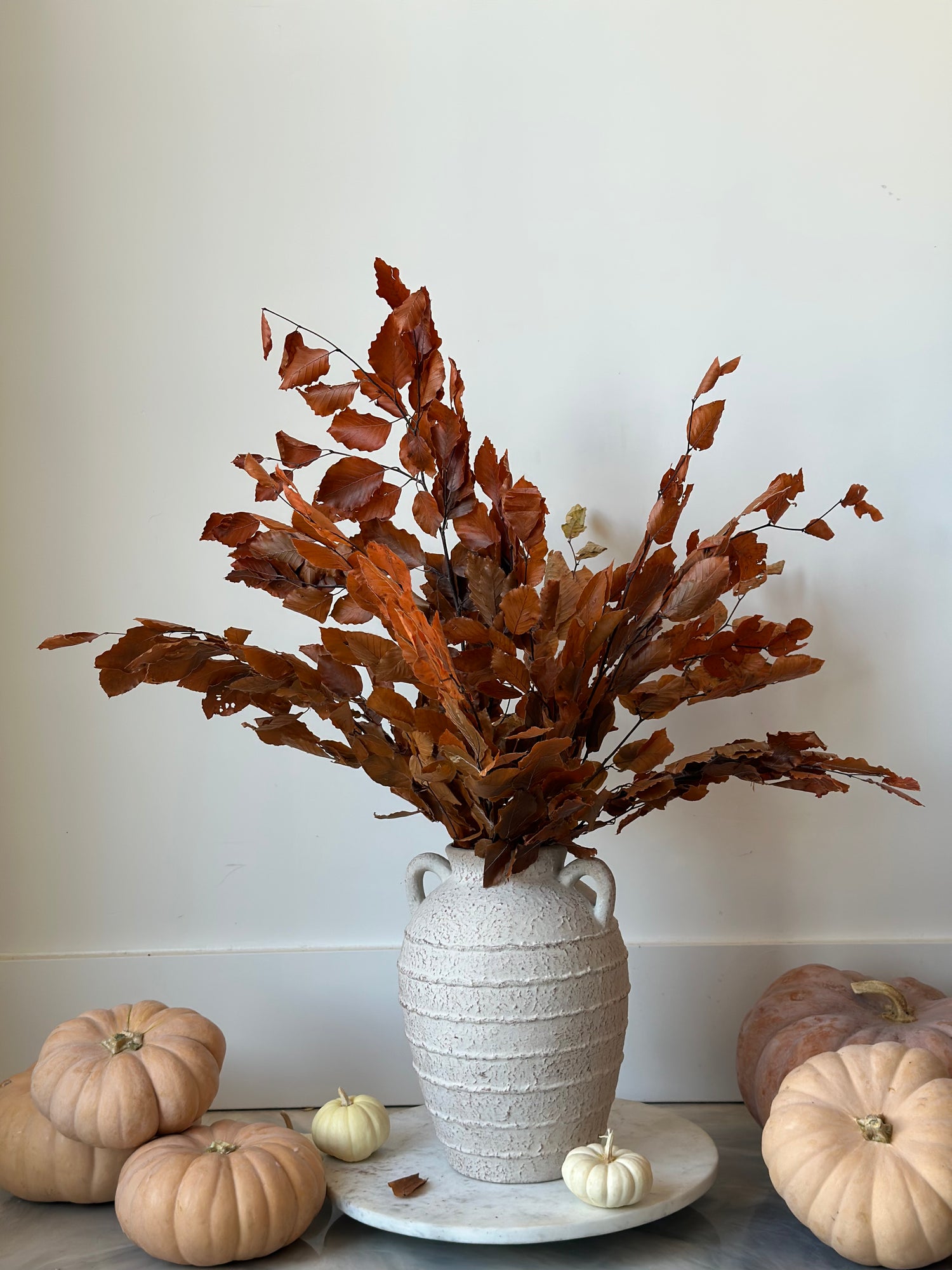 A sleek, modern centerpiece in a beautiful vase featuring elegant copper beach leaf branches. Designed to highlight the warm, radiant tones of fall, this arrangement brings sophistication and seasonal elegance to any space.