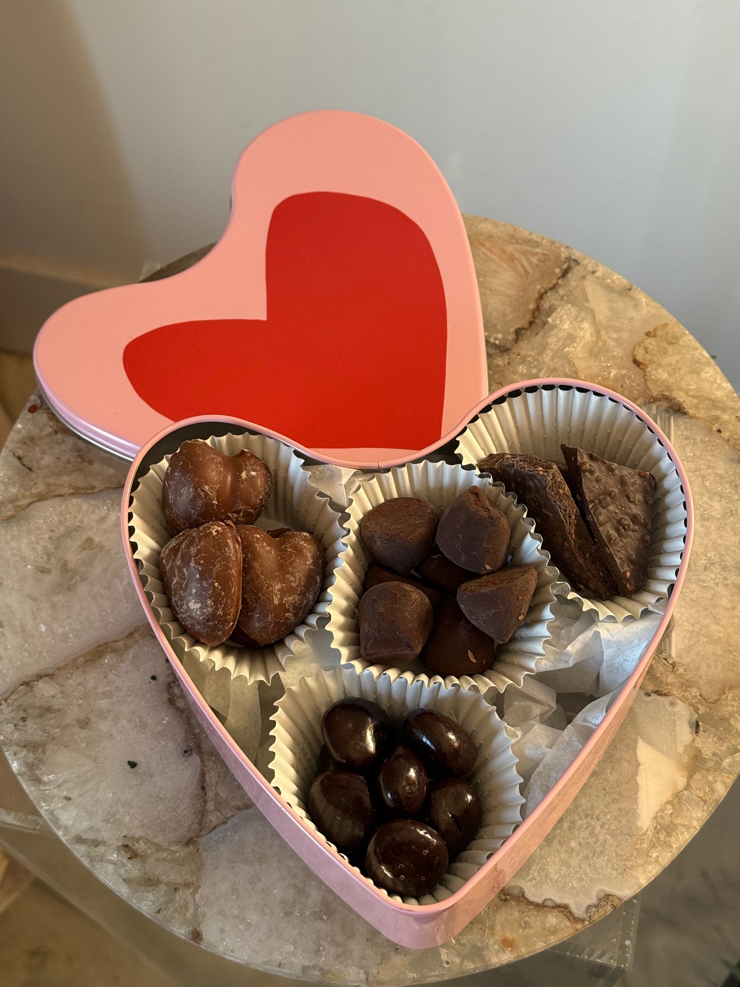 A decadent heart-shaped box filled with handcrafted chocolate favorites, thoughtfully curated for Valentine’s Day. This indulgent assortment includes rich cocoa truffles, dark chocolate–covered cherries, milk chocolate–dipped marshmallow hearts, and dark chocolate bark studded with puffed quinoa and dried raspberries. A luxurious way to celebrate love, sweetness, and all things chocolate.